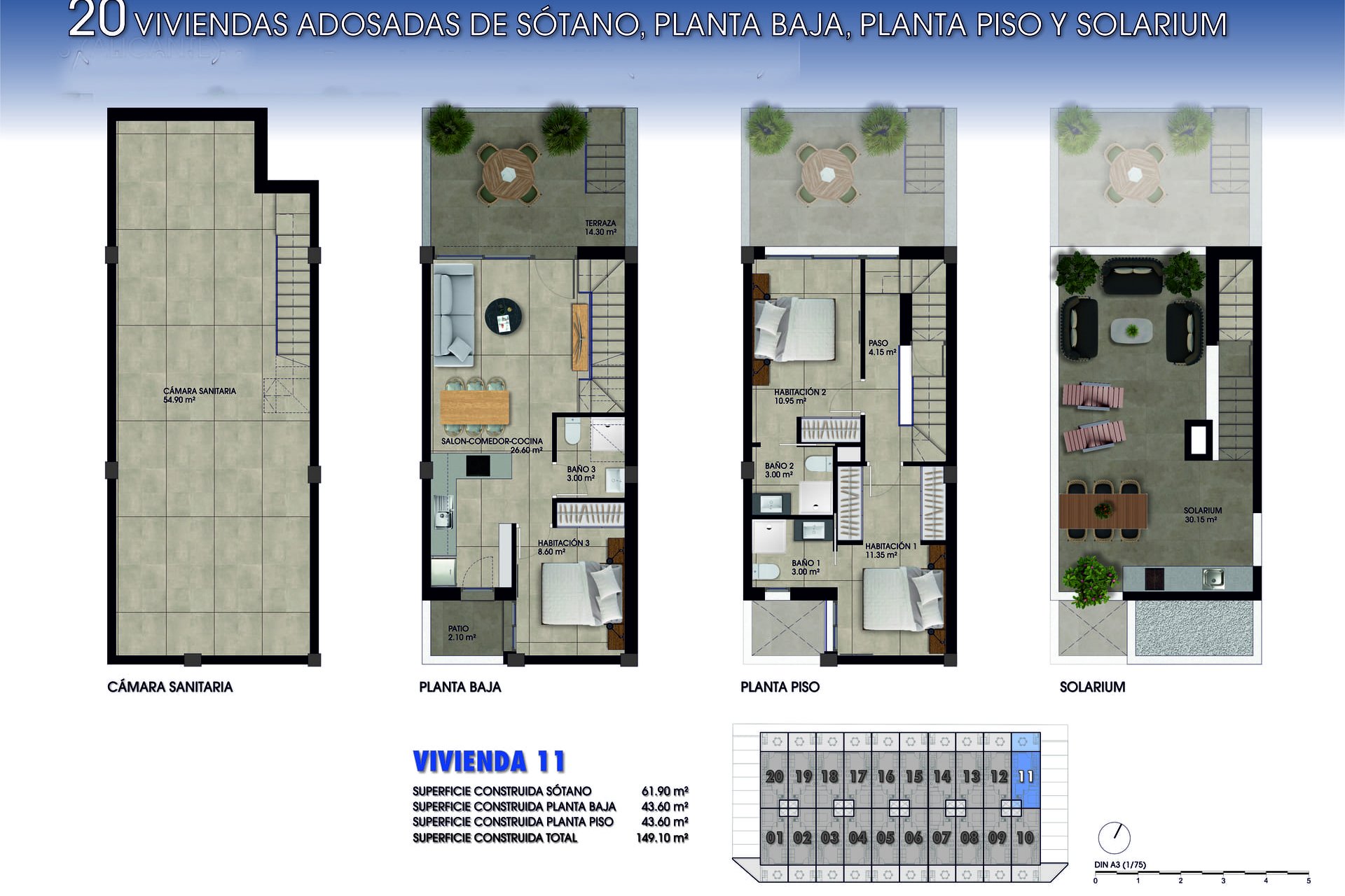 The outdoor spaces of these townhouses in Dolores are designed to maximize enjoyment of the Mediterranean climate. Each home features a private terrace, a perfect space to enjoy outdoor moments, whether relaxing, sharing with friends, or simply enjoying a dinner under the stars. Additionally, the solarium is a standout feature, providing additional space for sunbathing or creating a small urban garden. The exterior architecture harmoniously integrates with the surroundings, offering a modern design that complements the natural beauty of the area.