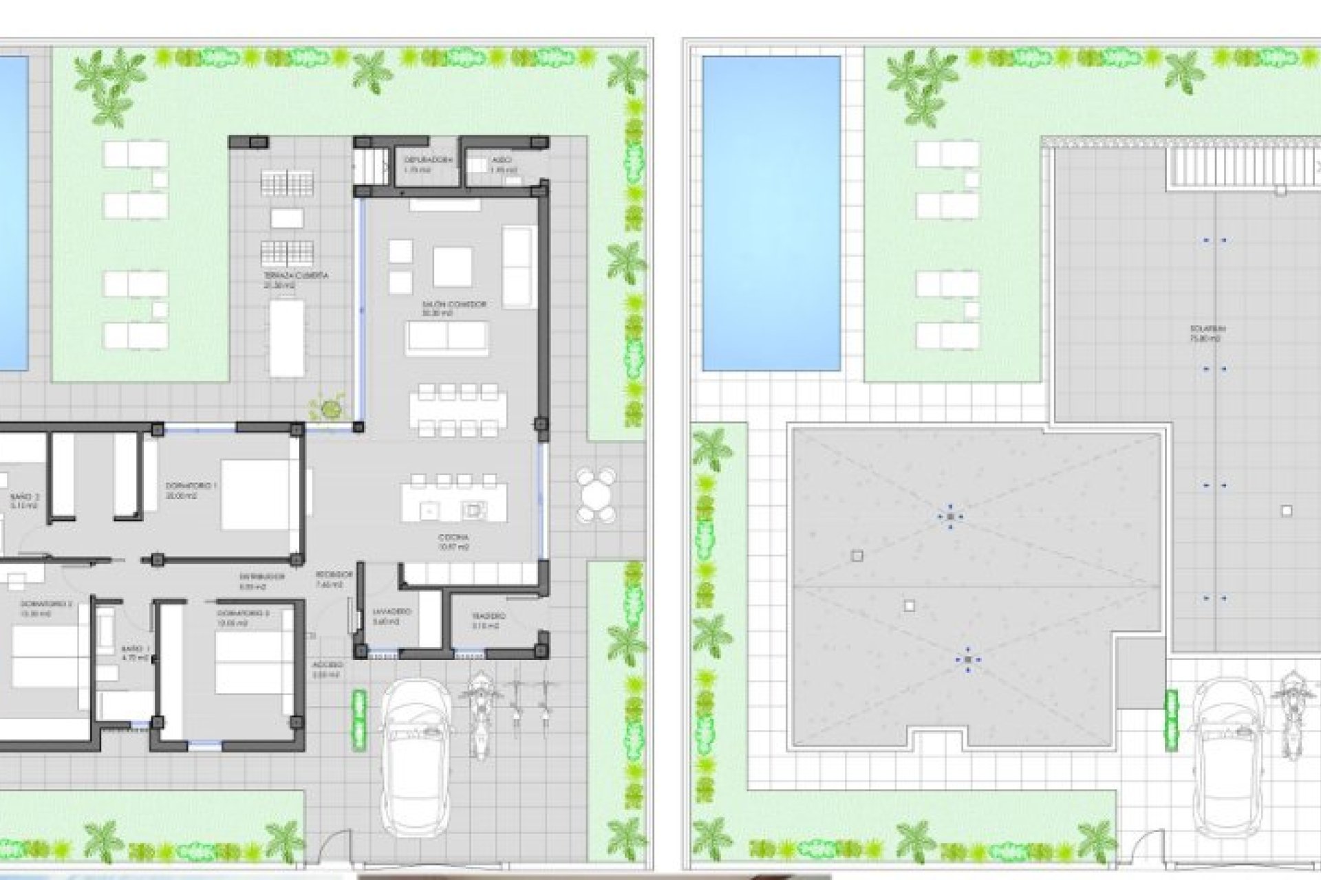 The exteriors of these independent homes in Mar de Cristal are designed to maximize enjoyment of the Mediterranean climate. Each property features a private pool, perfect for cooling off during warm summer days. The terraces offer additional space for outdoor relaxation, whether sunbathing or enjoying an al fresco dinner. The solarium is another attraction, providing an ideal place to take in the views and enjoy moments of tranquility. The presence of a private garage ensures convenience and security for vehicle parking.