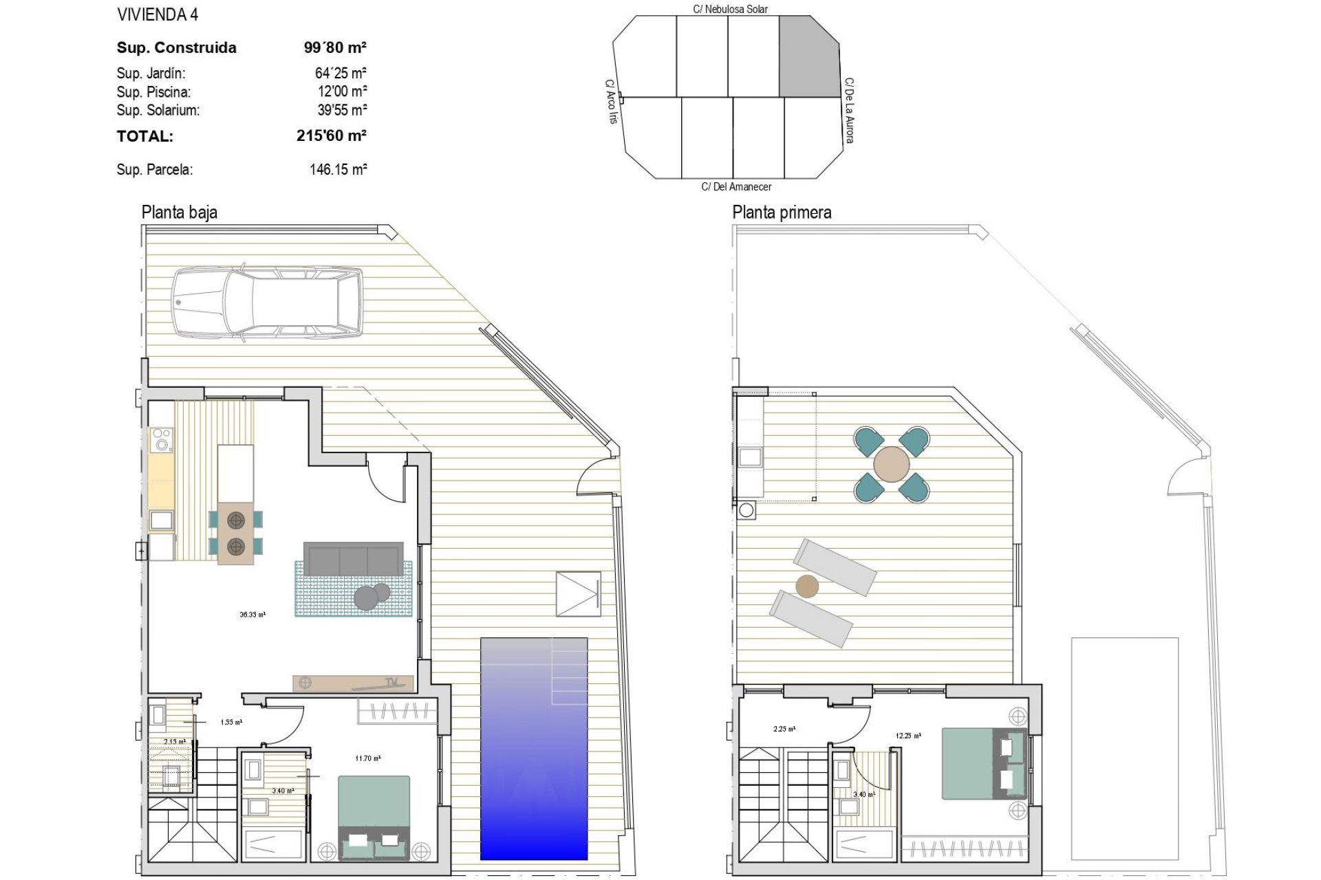 2Presented as an exclusive development in Residencial El Alba, Roldán, Murcia, offering 8 semi-detached villas with outstanding features. Each property, with 2 bedrooms and 2.5 bathrooms, stands out for its elegant and functional interiors, including fully fitted kitchens and furnished bathrooms. The bedrooms have built-in wardrobes and pre-installation for air conditioning. The properties feature a private swimming pool, solarium with summer kitchen, and pre-installation for electric car chargers, emphasising comfort and sustainability. The area, with plot sizes between 135 and 151 m², is located in Roldán, close to the coast and the Mar Menor, ideal for water sports enthusiasts and those seeking tranquillity without renouncing proximity to the golf courses and beaches of the Costa Cálida. The development promises a high quality lifestyle with top quality finishes, doubling the commitment to modernity and functionality in a privileged setting.