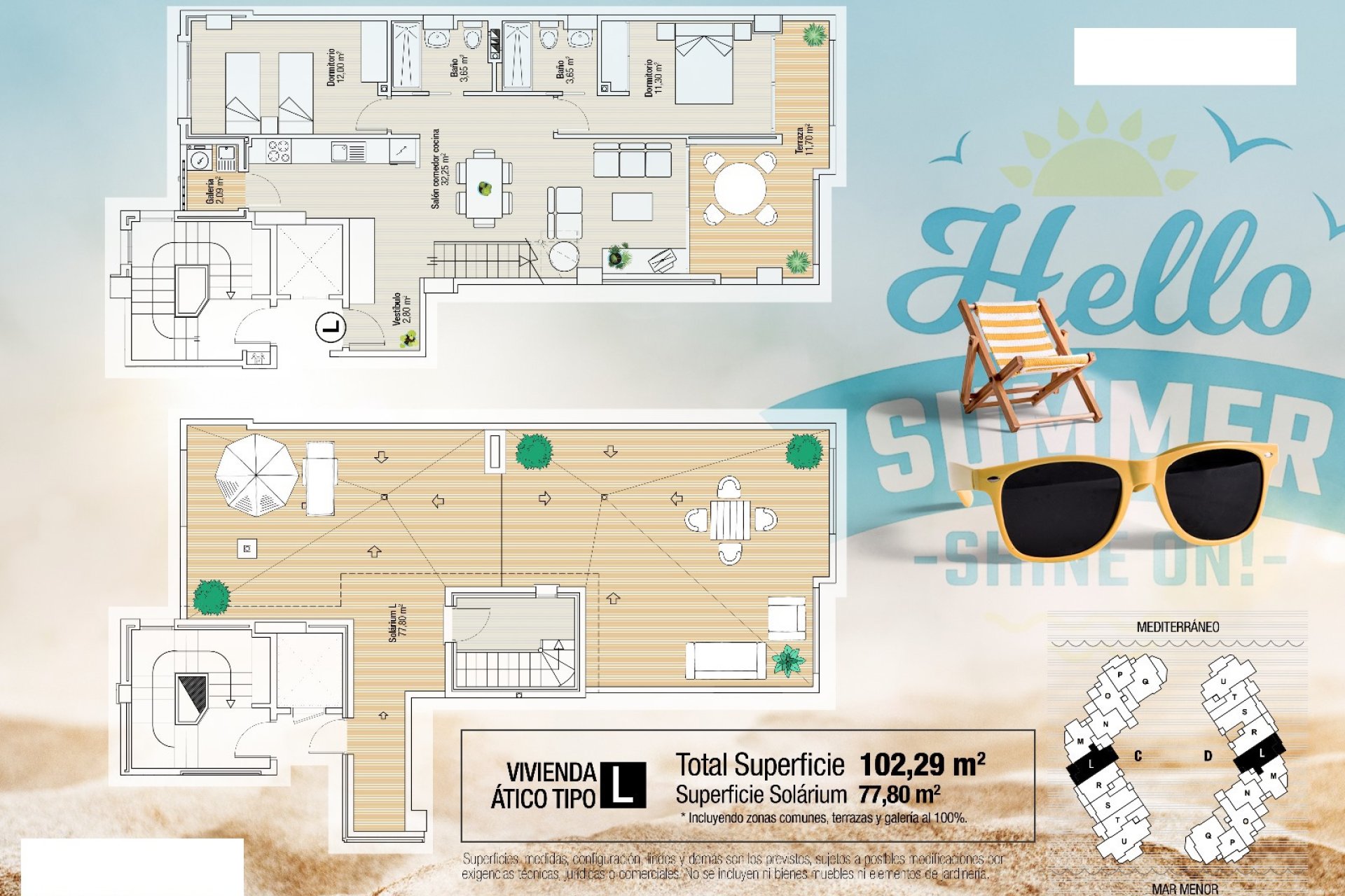 The exteriors of this residential complex in La Manga del Mar Menor are designed to offer an environment of tranquility and enjoyment. The residences feature private terraces, perfect for relaxing while overlooking the sea. Additionally, the penthouses have solariums, providing extra outdoor space to enjoy the Mediterranean climate. The communal garden areas add a touch of nature and freshness to the complex, creating a pleasant and welcoming atmosphere. The privileged location allows for sea views from various points of the complex, making every moment a unique experience.