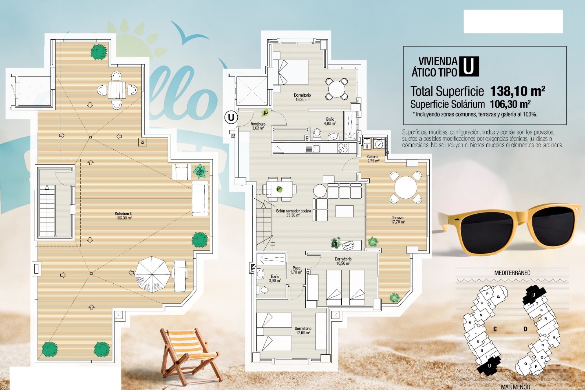 The exteriors of this residential complex in La Manga del Mar Menor are designed to offer an environment of tranquility and enjoyment. The residences feature private terraces, perfect for relaxing while overlooking the sea. Additionally, the penthouses have solariums, providing extra outdoor space to enjoy the Mediterranean climate. The communal garden areas add a touch of nature and freshness to the complex, creating a pleasant and welcoming atmosphere. The privileged location allows for sea views from various points of the complex, making every moment a unique experience.