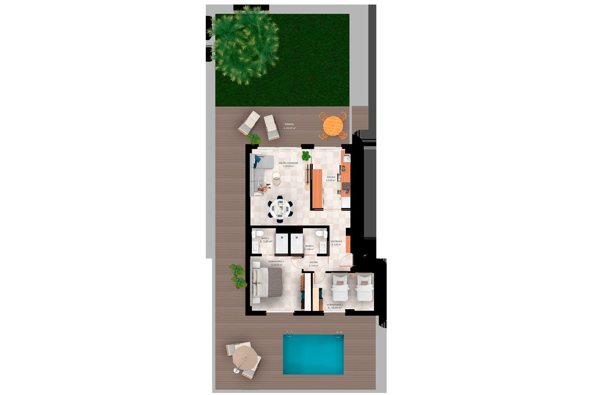 The homes feature outdoor spaces that invite relaxation and enjoyment of the Mediterranean climate. Each property has a terrace and solarium, perfect for sunbathing or enjoying an outdoor dinner. Additionally, some types offer the possibility of having a private garden, expanding leisure and recreation options. The option of a private pool is available, allowing residents to enjoy a refreshing swim in the privacy of their home.