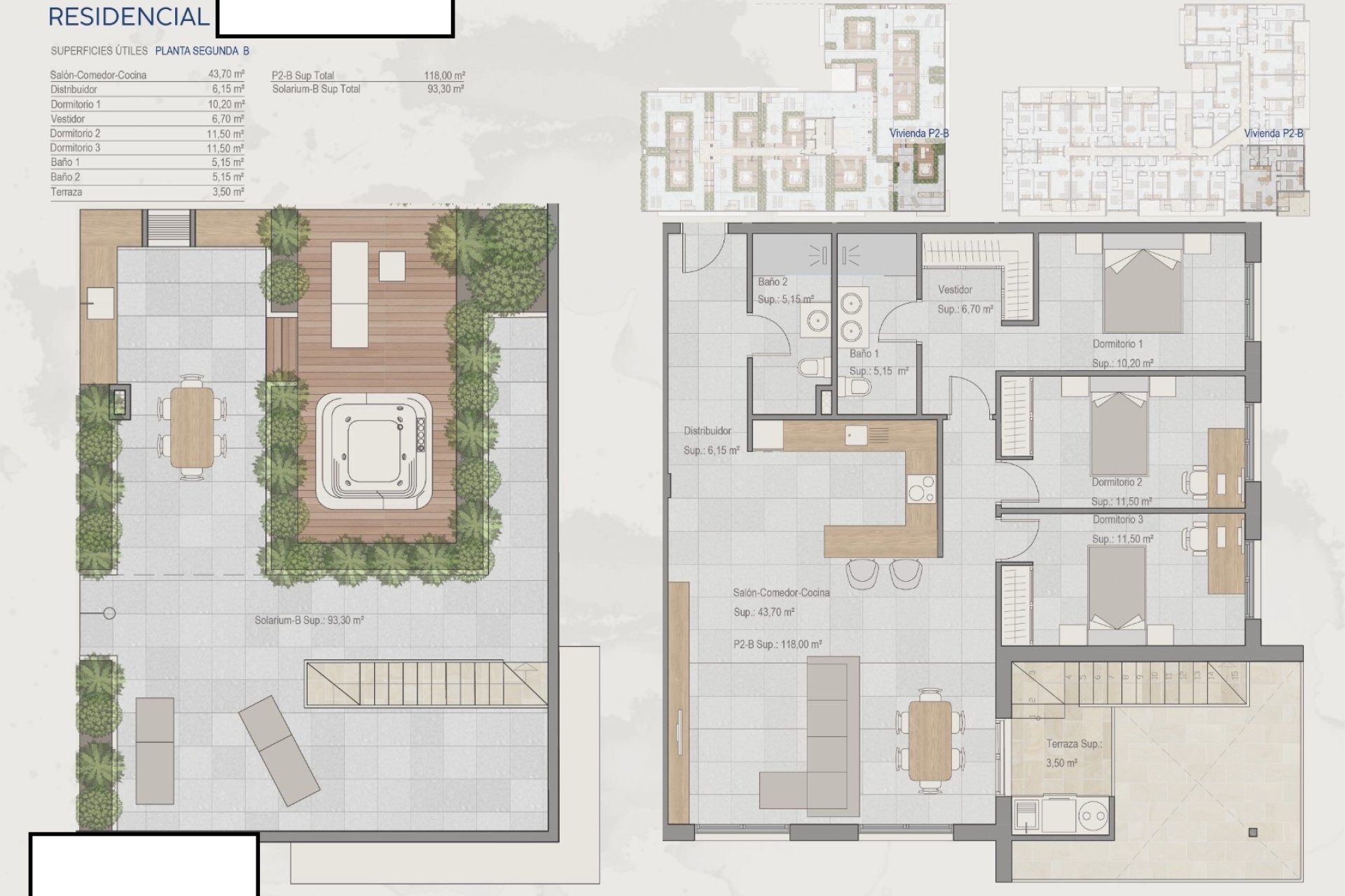 The interiors of the homes are designed to offer a cozy and functional environment. The apartments and penthouses come equipped with modern appliances, facilitating daily tasks. Ceramic floors add an elegant touch and are easy to maintain. Built-in wardrobes optimize storage space, maintaining order and aesthetics. Additionally, some properties feature a jacuzzi, adding a touch of luxury and relaxation to the home. The layout includes 2 or 3 bedrooms and 2 bathrooms, adapting to different family needs.