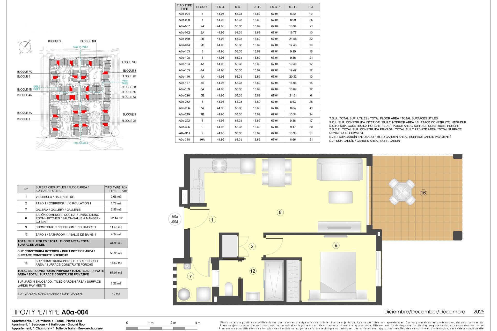 El interior de las viviendas está cuidadosamente diseñado para ofrecer confort y estilo. Los suelos de gres porcelánico aportan un toque moderno y son fáciles de mantener. Todas las propiedades están equipadas con armarios empotrados, optimizando el espacio de almacenamiento. La preinstalación de aire acondicionado asegura un ambiente agradable durante todo el año. Las opciones de distribución incluyen viviendas de 1, 2 y 3 dormitorios, con 1 o 2 baños, adaptándose a diferentes necesidades familiares.